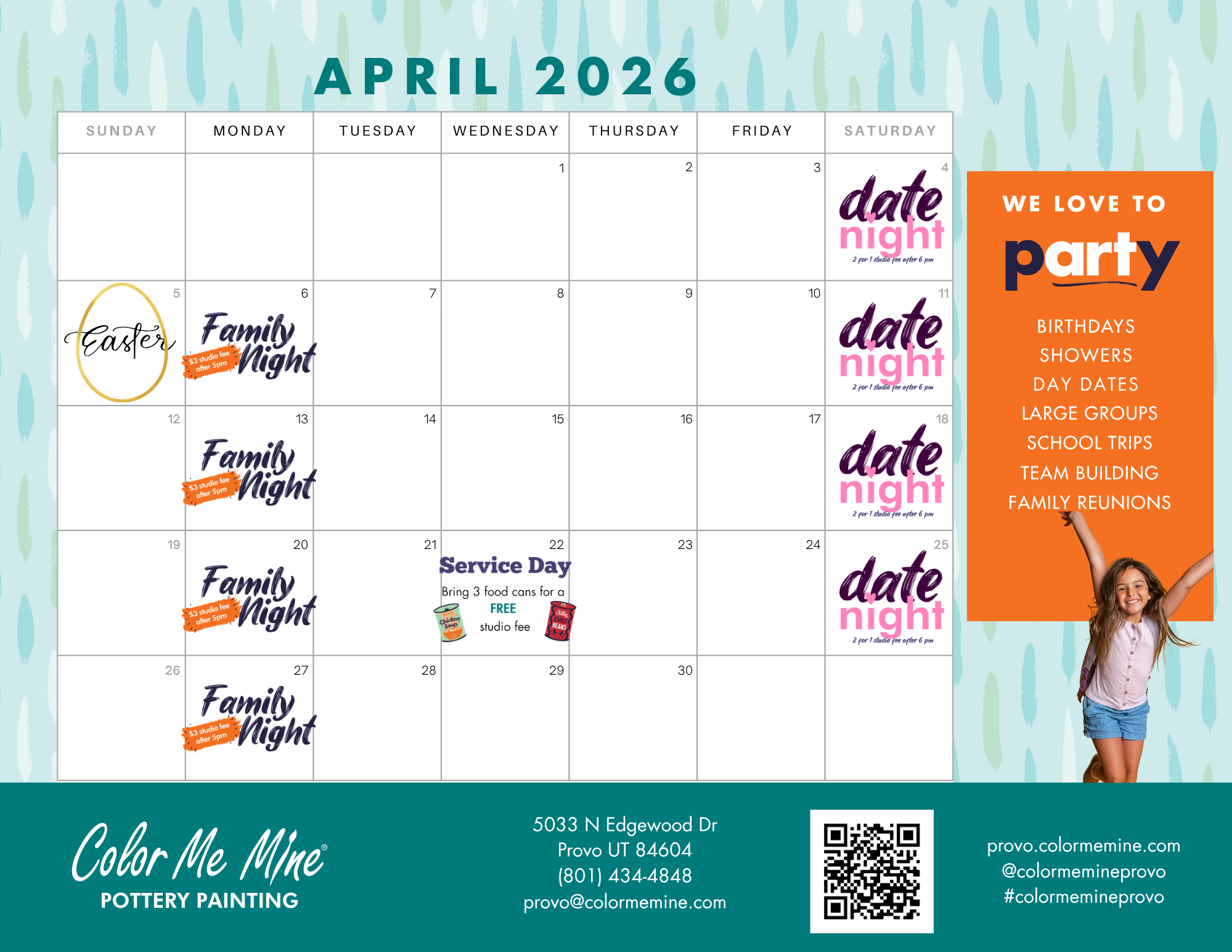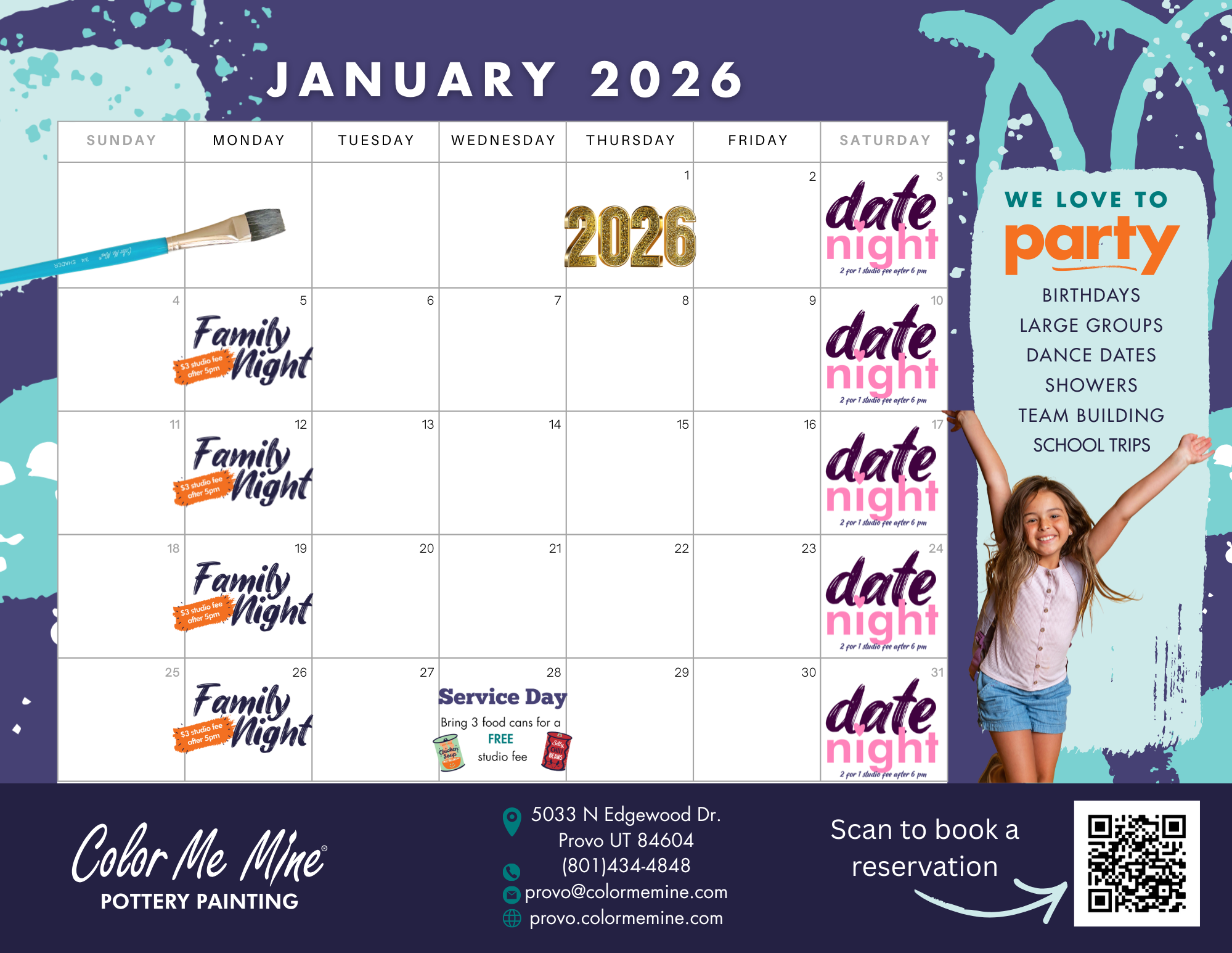 - Monday Family Nights: $3 studio fee per painter after 5PM every Monday